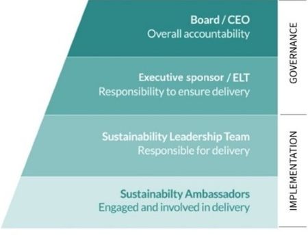 ทีมผู้นำระดับบริหาร (ELT) ทำหน้าที่เป็นคณะกรรมการกำกับดูแลด้านความยั่งยืนในระดับผู้บริหาร โดยกำกับดูแลการตรวจสอบและอนุมัติการตัดสินใจเชิงกลยุทธ์ที่สอดคล้องกับแผนงาน "โลกของเรา แผนของเรา" อย่างแข็งขัน ภายใน ELT ผู้สนับสนุนระดับบริหารมีหน้าที่รับผิดชอบหลักในการบริหารจัดการด้านความยั่งยืน เพื่อให้มั่นใจว่าสอดคล้องกับเป้าหมายขององค์กรในวงกว้าง